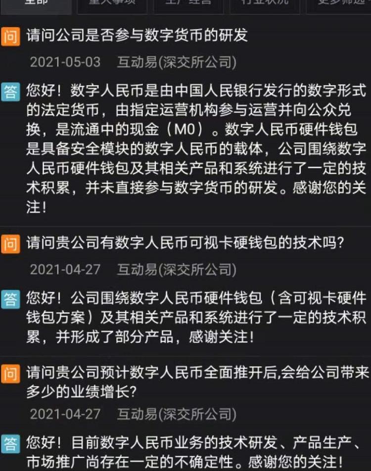 资料显示,公司是一家多领域高端智能卡及配套软件、智能终端设备、数字档案、应用平台系统及安全解决方案的提供商。而在互动平台上,投资人多次询问公司参与数字人民币的相关情况。