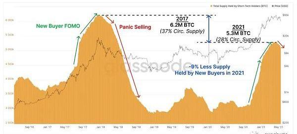 Glassnode称,短期持有者所占供应份额的波动率表明了恐慌性抛售,并指出近期供应分布模式与2017年牛市宏观高峰期间观察到的模式之间的相似性。当新的持有者持有相对较大的供应份额时,市场通常会找到一个宏观峰值。
