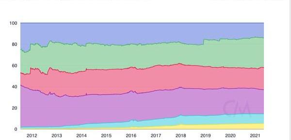 最后,我们增加了一套供应分布指标。下面的图表显示了不同范围的地址所持有的BTC总供应量的百分比。从图表底部往上看,第一个区间显示了由持有0到1个BTC的地址控制的百分比,下一个区间显示了由持有1到10个BTC的地址控制的供应量。