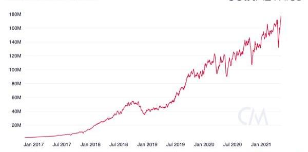 比特币的算力在5月初飙升,达到历史新高,此前在4月中国的区域性停电迫使一些矿机下线,比特币的算力大幅下跌。这次下跌吓坏了一些投资者,他们担心可能会有更大的跌幅而卖出。但不到一个月,算力已经完全恢复,并回到了比下跌前更高的水平。