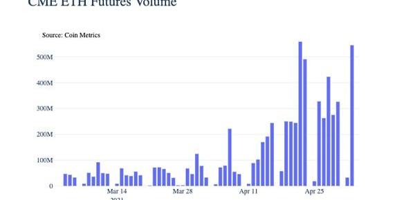 CME于2017年12月首次推出BTC期货。但他们只是在2021年2月添加了ETH期货。尽管CME以太坊期货交易量在3月份相对较低,但在4月份却飙升,达到了每天超过5亿美元的高位。