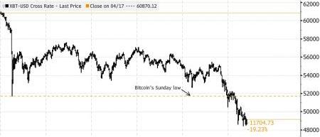 摩根大通公司和塔巴肯资本顾问公司警告说,在加密货币从4月14日的创纪录高位64,870美元回落之后,还有进一步下跌的可能。