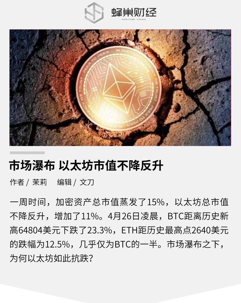相同周期内,以太坊总市值不降反升,从2379亿美元最高飚至3041亿美元高点,目前保持在2657亿美元。4月26日凌晨,BTC距离历史新高64804美元下跌了23.3%,ETH距历史最高点2640美元的跌幅为12.5%,几乎仅为BTC的一半。