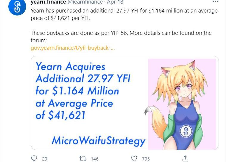 Yearn.Finance是一个基于以太坊的知名DeFi协议,其在4月18日宣布已回购了价值116.4万美元的YFI。