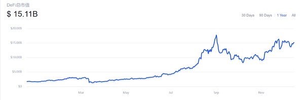 从欧科云链追踪的77个主要DeFi项目的市值增长情况来看,DeFi市场和应用增长情况尤为明显,过去一年里,6月到9月份是DeFi项目应用市值增长最快的3个月,增长了将近4倍,到了9月初后触顶回落之后一直在低位盘旋,11月份开始有所回升,目前距离前高的位置还有一些距离。
