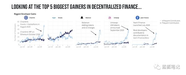 在DeFi领域,Uniswap、Chainlink、Gnosis、Balancer、Yearn(YFI)、MCDEX、ACALA等开发者数增长迅速。