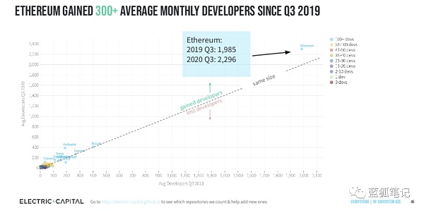 以太坊生态最活跃,跟三年前相比,其月度活跃开发者增长超过215%。从2019年Q3以来,以太坊月度获得300+开发者。