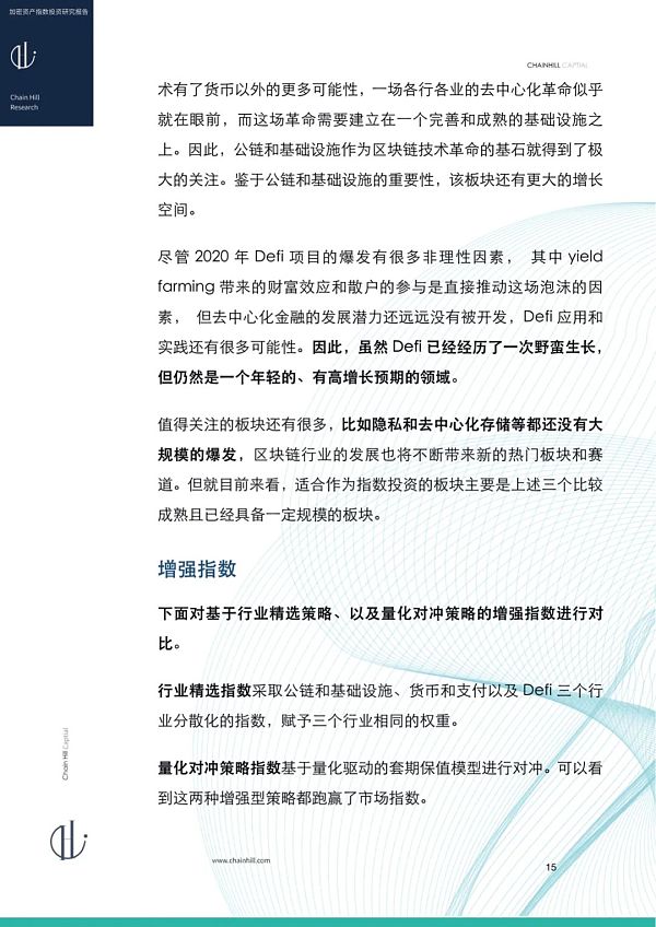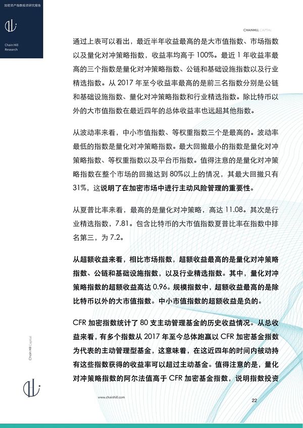 本文对各类加密资产指数进行了详细分析和阐述,通过统计数据对不同类别的加密资产指数进行研究和论证,从而得出不同于传统金融市场指数投资,在介入适当主动管理的情况下,加密资产指数投资更有可能提供比主动基金更高的超额收益的结论。