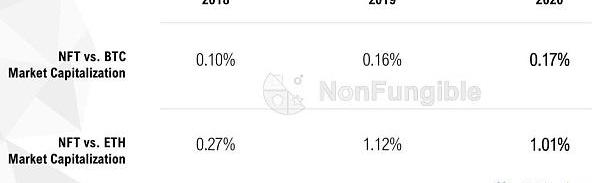 由此可见,2019年,NFT在加密寒冬期间取得了坚实增长:NFT在整个以太坊市值中占比1%?以上,对比特币市值也有一定收益。