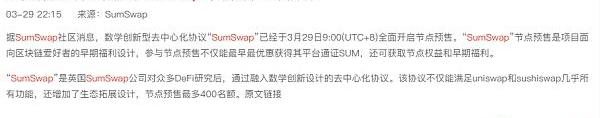 Sum节点争夺现在还处在白热化阶段,报名不一定能成为预备节点,预备节点不一定能成为正式节点,这种争夺恰恰体现了Sum的稀缺性,现在只有800万枚SUM用于节点预售,数量有限,财富机遇总在不经意间开启,如果你错过了10年前的茅台股票,也错过了7.5美元的特斯拉上市股票,更加错过了用披萨换来的比特币,那么请你不要在错过SUM!入手最低价的SUM,下一个链圈的财富神话就是你!如果您想了解更多关于sumswap的详细信息,添加微信whh392