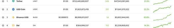 稳定币市值排名前五的分别为USDT、USDC、BUSD、Dai和UST,其中USDT、USDC和BUSD每一枚稳定币背后都有至少一美元的资产被抵押作为价值支撑。