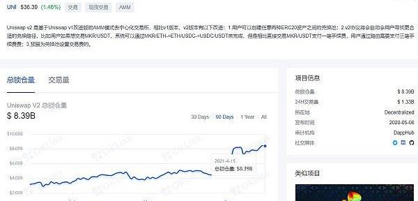与UNI价格上涨相对应的是,欧科云链OKLink数据显示,截至4月15日10时,UniswapV2的流动性约合83.9亿美元,创下历史新高。近30日以来,UniswapV2的流动性增长达74%。