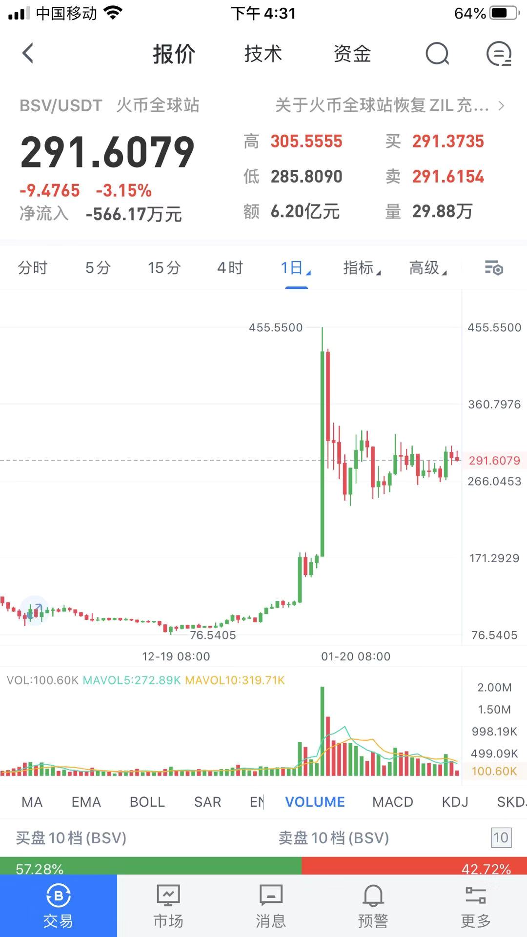 前面我们说到,有人关注,有人投资,就是需求。需求和持币主力的买卖,最终会体现在价格上,比特币以及BCH、BSV的价格变化背后是巨额资金的周转,我们所看到的24小时交易额就是最直接的体现。