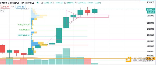 比特币收周线之际创了历史新高,最高打到了24288美金,随后推高资金获利了结,一度又跌到23100美金,目前价格再度回到24000美金附近,波动非常剧烈。OBV可以观察到,虽然币价连续在23000-24000美金区间震荡,但资金还是持续堆积的,目前OBV虽然出现回撤,但依旧处在高位,加之盘口观察到,资金获利了结的单子,很快被几波资金分食,整个过程非常迅速;持仓量还在不断攀升,分歧正在加剧,多空都在加码,接下来的变动会非常剧烈,各位尽量不要开杠杆,这么大的波动5倍杠杆都难免爆仓,大行情来的时候稳步前行盈利会更为可观。比特币周线收的非常漂亮,有望继续上行到25000美金附近,下方支撑位置在23100美金。