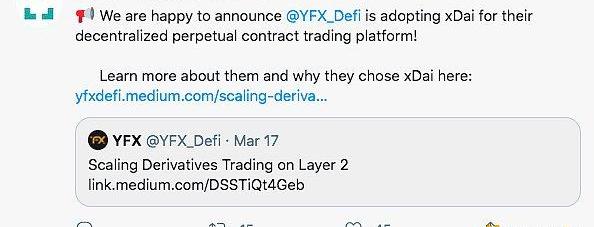 很荣幸的是,xDai这边也对YFX.COM给予了肯定哈,这个是他们的官方推文: