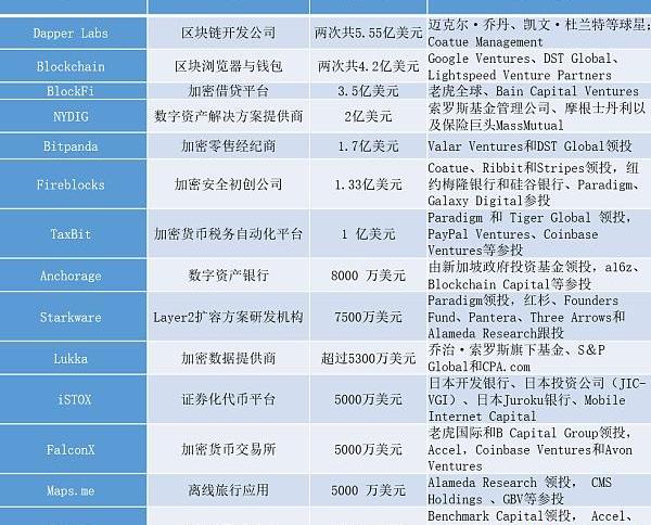 更具体来看,融资金额最高5个项目分别是DapperLabs、Blockchain.com、BlockFi、NYDIG、BitPanda,融资金额分别达到5.55亿美元、4.2亿美元、3.5亿美元、2亿美元与1.7亿美元,估值均突破10亿美元,此外Chainalysis估值也突破了10亿美元,均成为加密市场的独角兽企业,链捕手下面简单介绍下这几家公司。