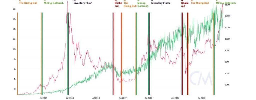 在TheAlchemyofHashpower一文中,根据比特币价格和网络哈希率之间的相对变化率,我们介绍了挖矿市场周期的四个基础阶段。