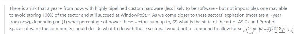 正如nicola所言,使用V1证明算法的扇区,可能在一年之后,矿商可以通过硬件的开发和升级达到即使扇区不存储数据,也能继续向链提交自己持续存储了数据的证明。