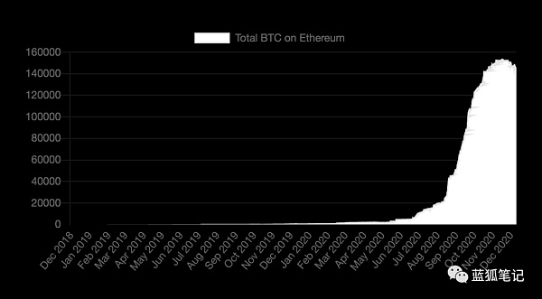 DeFi在以太坊上的成功也促使其他链的资产试图参与到DeFi的发展中来,例如比特币通过中心化的包装方式(如wbtc),在以太坊上实现了流通。目前在以太坊上流通的各种代币化btc,大约14万个,价值超过36亿美元。