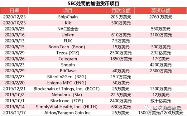 SEC处罚过得加密项目不只是瑞波,在之前三年里就已经处罚过大大小小17家,但是以往的处罚都是罚款了事,其中包括EOS(柚子罚了2400万美金)和XTZ(处罚2500万美金)。