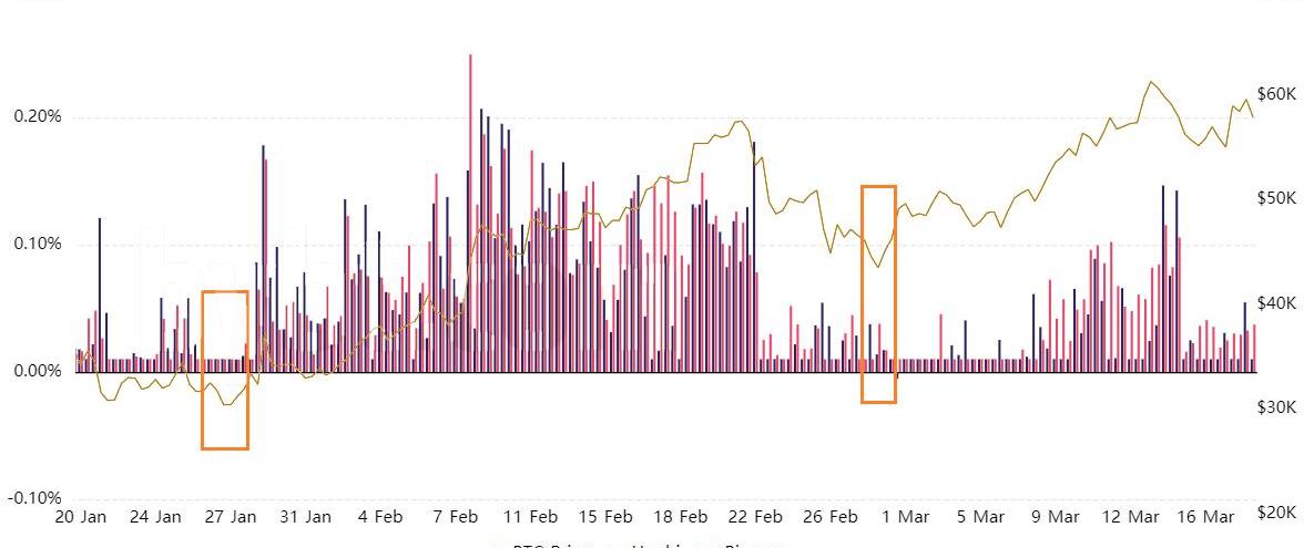 另一方面,1月27日和2月28日的比特币价格底部形成在资金费率较低的时候。这些时刻表明,交易员不愿利用杠杆做多,也证明了他们缺乏信心。