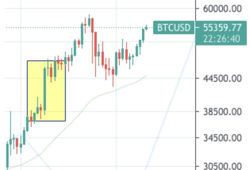 有趣的是,在过去的24小时里,价格一直在稳定增长。这可能完全是巧合,但也有可能是猜测或内部知情的市场参与者在投机。在特斯拉宣布购入15亿美元比特币之前的几天,比特币价格一直在稳步上涨,这可能是由于内部人士对随后的公告有所了解。