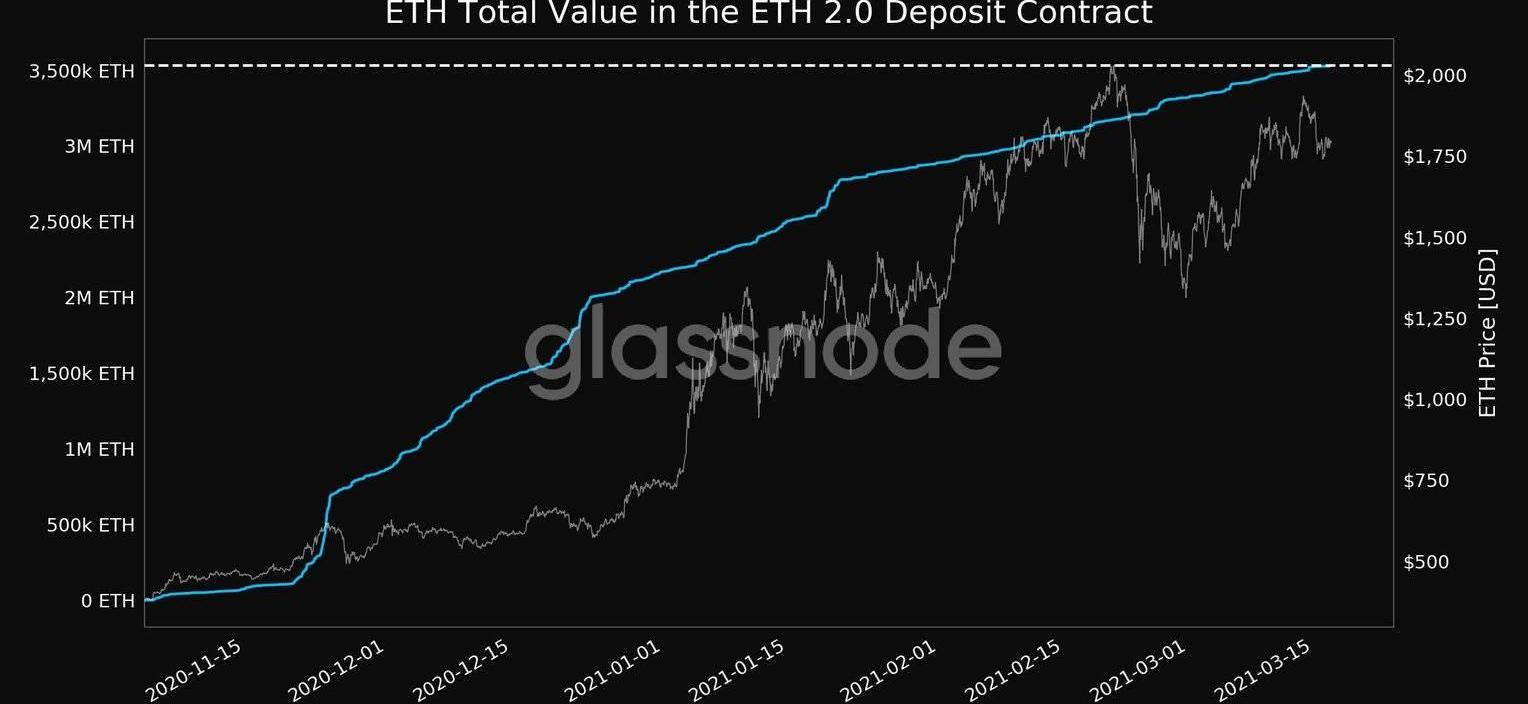 以太坊2.0存款合约中锁定的ETH价值。资料来源:Glassnode