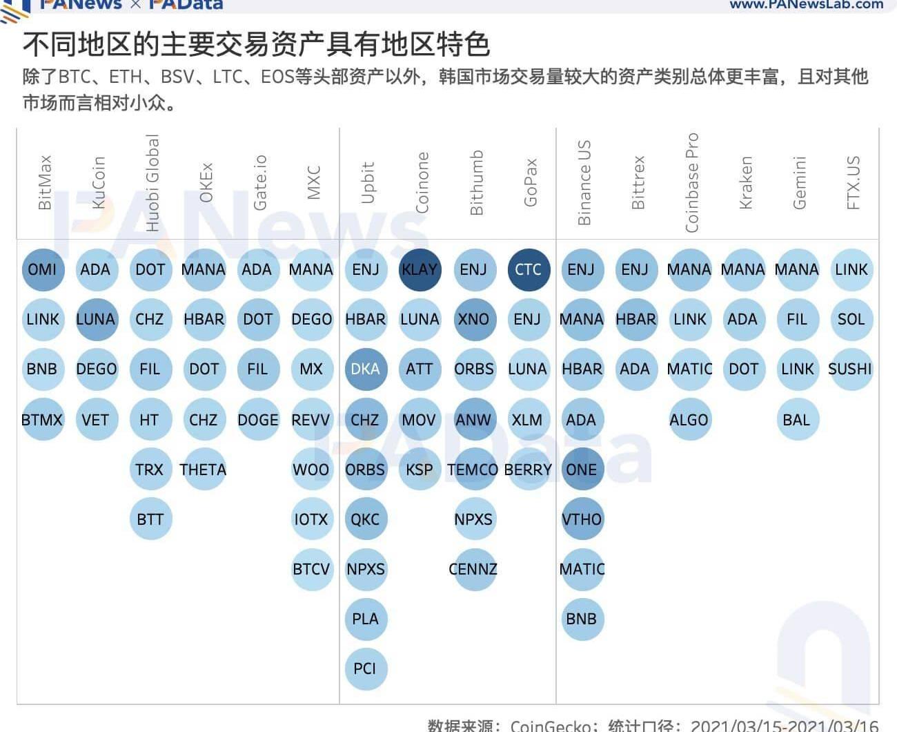 PAData根据CoinGecko为交易所划分的所属地区,以及交易所的地区市场声量和主要用户所属地区,选择了中美韩三国共17个交易所进行观察,深度分析了近期交易数据后发现: