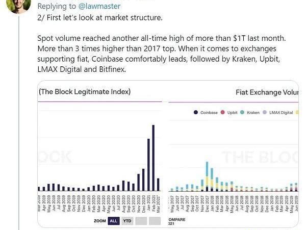 今年以来,随着比特币暴涨,加之Coinbase筹备上市,其现货交易量创下历史新高。3月8日,TheBlock研究总监LarryCermak发推称,在2月份加密资产现货交易量再创历史新高,超过1万亿美元,比2017年的最高水平高出3倍以上。其中,在支持法币的交易所中,Coinbase交易量遥遥领先。