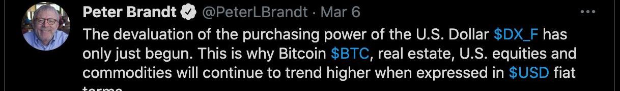 资深交易员PeterBrandt周日发推警告称:“因为美元的购买力下降了,所以当用美元作为法定货币表示时,比特币,房地产,美国股票和大宗商品市场都在持续走高。”