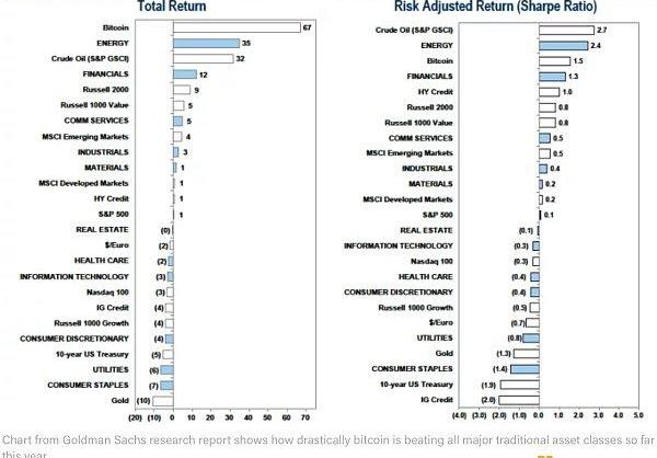 直到1月底,高盛才将BTC与全球资产进行对比排名,虽然如此,自2021年开始至今,BTC的回报率是能源行业的两倍。