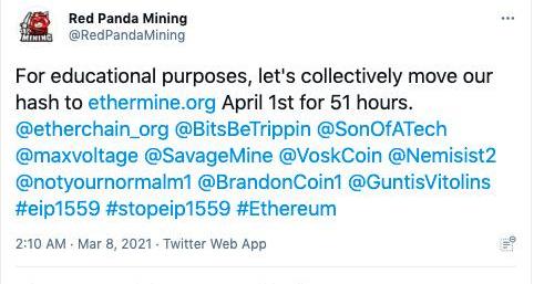 近期,推特网友「RedPandaMining」发起一项运动,号召反对EIP-1559的矿工,将算力切换至反对派矿池,宣誓主权。