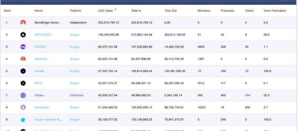 上图展示了DeepDAO上的一些去中心化自治组织关键指标