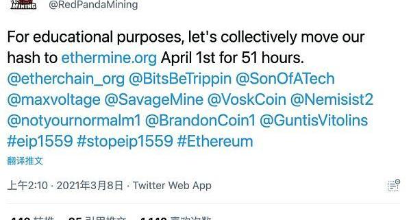目前很多以太坊矿池对EIP-1559持反对态度。推特用户@RedPandaMining在3月8日发推文号召以太矿工在4月1日举行51小时的算力展示,将算力转移到反对1559的矿池Ethermine去。当然显然也是在向外界表明,这些反对矿工算力或有可能超过当前以太坊网络算力的51%。