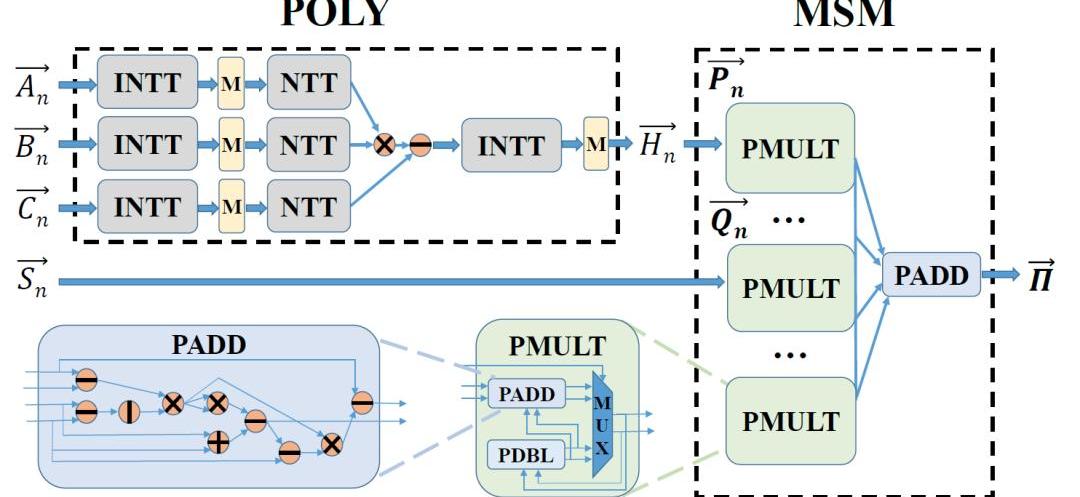 为实现更高效地支持现实世界中零知识证明算法的广泛应用,论文提出了名为“PipeZK”的高效的流水线芯片架构。芯片的综合和仿真结果表明,对于完整的证明产生过程,PipeZK可以将常规的密码学测试集的证明时间缩短10倍以上,可以将隐私货币Zcash的证明时间缩短5倍以上。