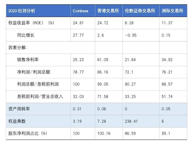 根据杜邦分析进一步分解,除资产周转率与权益乘数外,其他指标基本与三大传统交易所持平。资产周转率是ROE增长的主要贡献力量,20年Coinbase资产周转率为0.31,而香港交易所、洲际交易所分为仅为0.06与0.05,伦敦证券交易所甚至为0。Coinbase作为虚拟数字货币交易平台,相较于其他三大传统交易所,虚拟市场特有的技术特性与应用场景,使得Coinbase的交易程序更为简单,生产经营更为快捷,能够用较少的资源获取更大的收入。