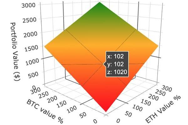 有三个轴可以参考;X是BTC的相对价值,Y是ETH的相对价值,Z是您投资的1000美元的价值。没有真正的起点,但我们应该以100(%),100(%),1000美元为点,然后看看当Token价值相对于其他Token上升或下降时会发生什么。