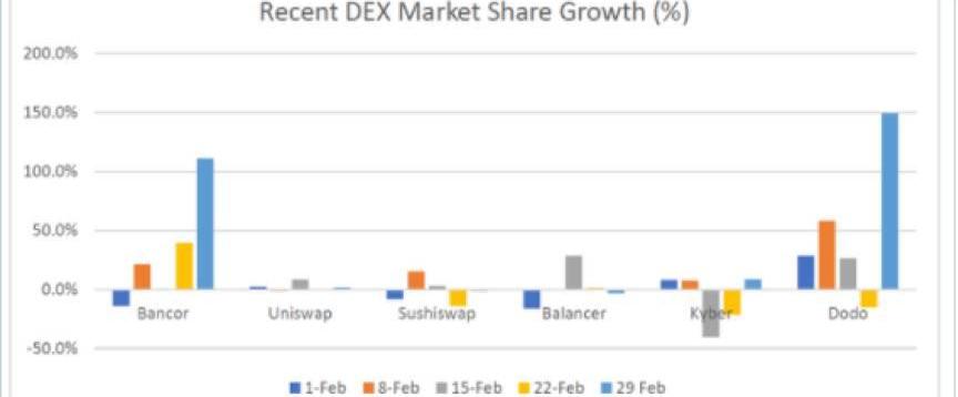 进行估值比较非常重要,通过比较,我们可以看出Bancor过去和未来的增长机会被严重低估。如下图所示,在最近几周时间里,Bancor和DODO占领了绝大多数DEX市场份额,我觉得Bancor的增长趋势不会就此停止。
