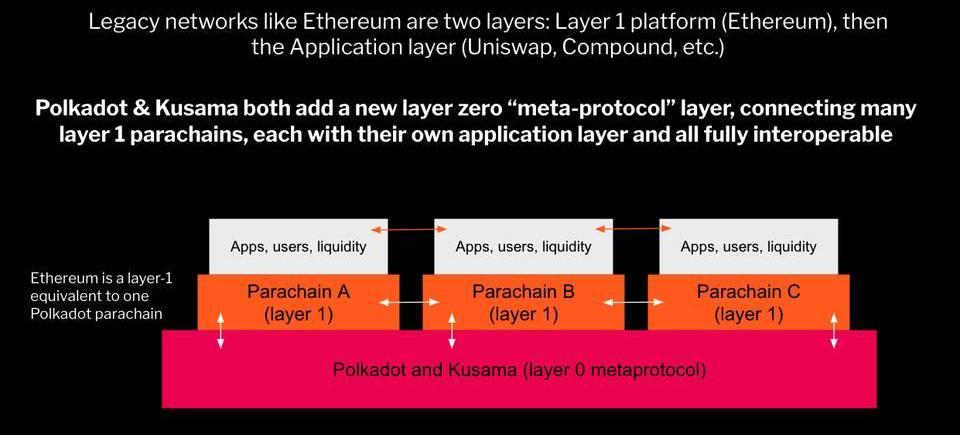 理解平行链竞拍之前,首先你需要了解波卡和Kusama的多链基础模型。与以太坊只有链和应用两层模型不同,波卡由以下三层组成: