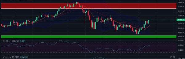 多头突破了布林带中间带,也达到了46,076.89美元的水平支撑位。在这些看涨压力和势头的推动下,比特币价格在收盘时上涨了12.28%,达到49,737.63美元的盘中高点。