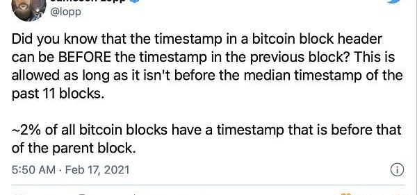 这是因为BTC协议允许负时间戳增量的存在,但这不是根本原因,我们要考虑到实际挖矿的工作过程: