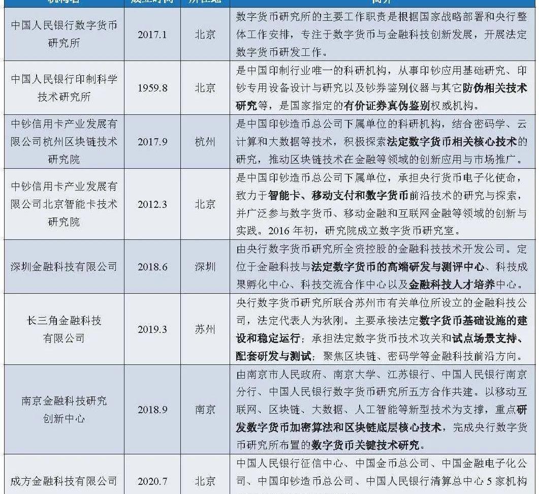 因此,从官方机构层面,我们可以梳理出如下表2-2所示的参与方,主要承担数字人民币的核心研究工作,这些机构中有6个成立于2017年以后,且集中分布在北京、广东和江浙地区,正是数字人民币率先开展试点的地区。