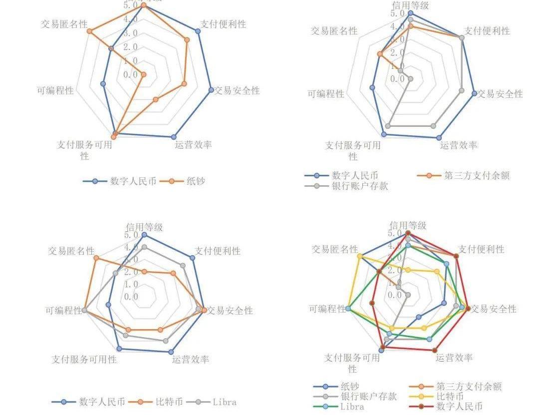 针对评估结果进行进一步比较可以看出数字人民币的优势:相较于现金,数字人民币在保证了信用等级和支付服务可用性的基础上,有效提升了交易便利性、安全性和运营效率;相较于第三方支付,数字人民币则是有效地减少了潜在的违约风险,并提高了支付的普惠性,但是目前相关设备还未完成改造,受支付服务的网络外部性影响,第三方支付仍是许多人支付的首选;相较于目前备受关注的数字货币——比特币和Libra,数字人民币的法定性则是最大的区别,能够保证交易的安全便捷,并保持价值的稳定。