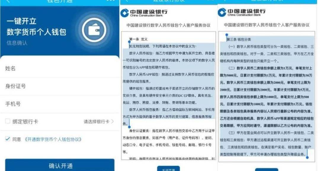 农行内测后,建行也在8月份开始了内测,并在其APP中开放了针对公众的数字人民币钱包开通界面,虽也没有实际推广使用,但进一步披露了分层限额的具体安排。