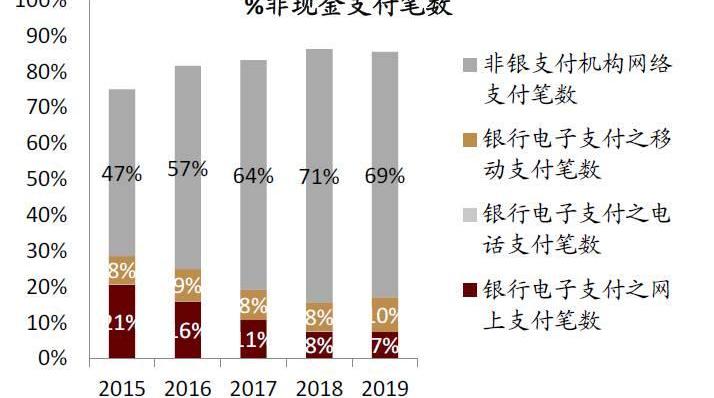 图表:非现金支付中移动支付和非银支付机构网络支付笔数占比提升