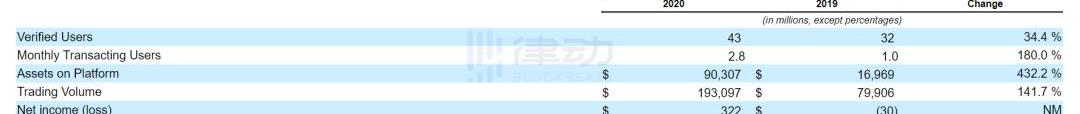 从交易量来看,Coinbase和所有平台一样也受到比特币等加密资产价格波动的影响。2020年全年,Coinbase的加密货币交易量约为1930亿美元,较2019年增长141.7%。此外,Coinbase用户持续稳定增长,截至2020年12月31日,该平台验证用户数量为4300万,较2019年底增长34.4%。