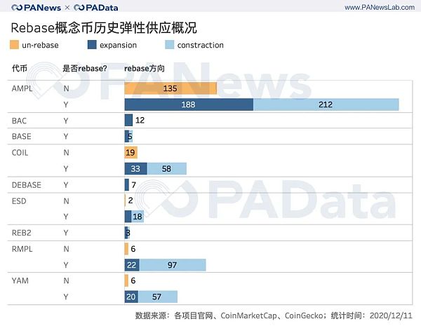 PAData分析了9种Rebase概念币的弹性供应情况,这里为了统一观察,假设弹性调整周期都为24小时,而实际上,一些概念币的弹性调整周期小于24小时,因此统计数值可能比实际偏小,分析结果只具有一定的参考性。