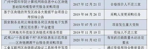 部分项目由于要求较高或需求专一,导致涉及领域较为前沿或该领域供应商有限,难以达到公开招标或竞争性磋商要求,或面临时间有限问题导致公开招标流程难以开展,经专家认证可采用单一来源招标方式。在政府区块链项目中,共有三个项目采用单一来源方式招标。