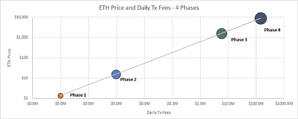 我注意到,有三个主要的阶段,它们与以太坊的三个价格范围相关。类似于PlanB的阶段模型,我将这三个时期概括为阶段及其每日交易费和以太坊价格平均值如下。