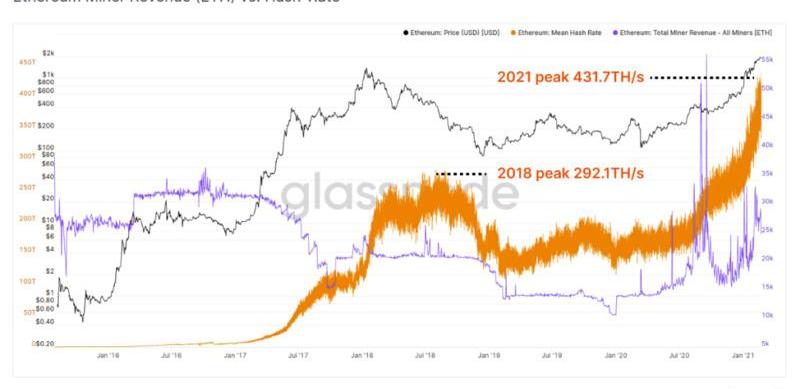 这意味着转账手续费收入与以太坊本身的区块奖励相当,从而使在以太坊挖矿利润大大提高。当前以太坊每日的挖矿收入约25000到30000ETH,这激励矿工将更多的哈希率带入以太坊网络,从而形成安全的能源和硬件保障。2月19日,以太坊的哈希率创下历史新高431.7TH/s,比2018年7月的市场周期峰值292.1TH/s高出近60%。